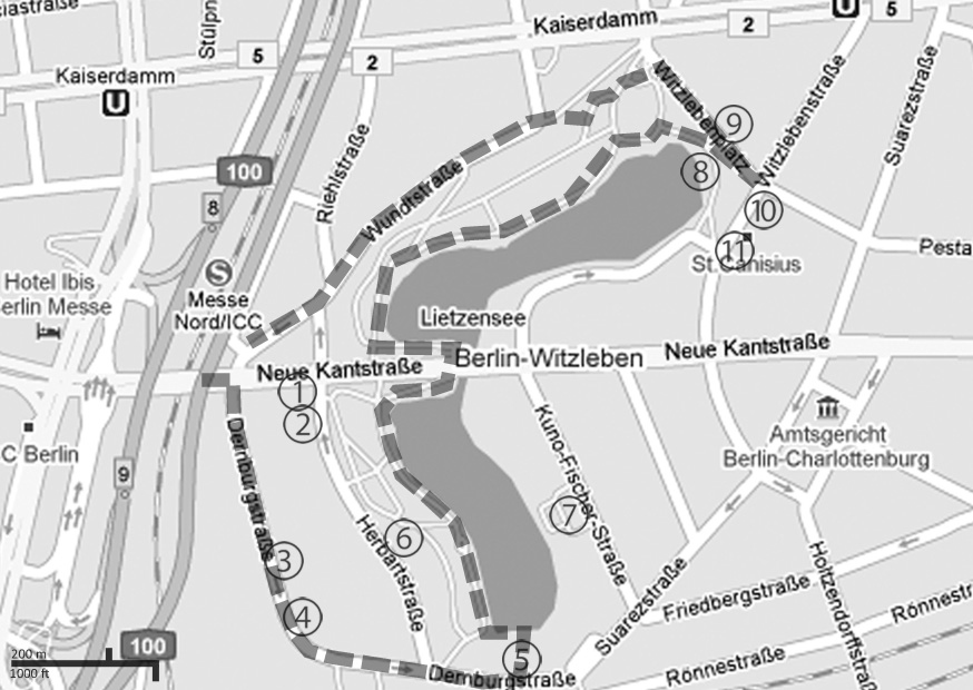 Den Rückweg zur Ringbahn findet man leicht, indem man am Westufer des Sees ein wenig zurückspaziert und beim großen Blumenbeet mit den beiden Laubengängen an zwei Springbrunnen vorbei hinaufsteigt zur Wundtstraße. Vornehme Altbauten blicken auf den hinter Bäumen nun wieder versteckten See, über die Kreuzung Riehl- und Herbartstraße hinweg läßt man die kleine innerstädtische Idylle hinter sich, bis die Wundtstraße an der nächsten Ecke auf die Brücke über Autobahn und Ringbahngleisen trifft, der Funkturm nicht mehr über Baumwipfeln, sondern hinter der tosenden Verkehrsschlucht steht und der Lärm der Stadt den Flaneur umfängt – die grünen Oasen innerhalb des Rings gehören zu Berlin wie seine faszinierend unwirtlichen infrastrukturellen Knotenpunkte.