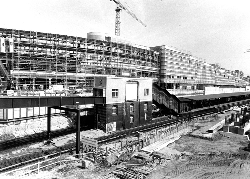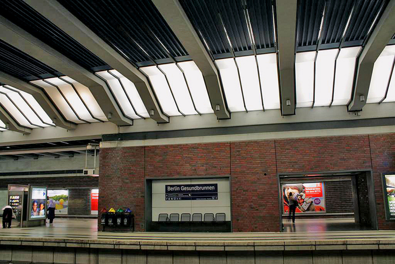 Die Station Gesundbrunnen bietet dem Ringbahnflaneur architektonische Kontraste. Säulen im grünen Marmor-Look, Backstein- und Klinkerverkleidungen im Stil der Neuen Sachlichkeit – edel geht es auf dem Bahnsteig zu. Eine Fahrt hinauf mit der Rolltreppe endet dagegen im Nichts einer gewaltigen Betonplatte, auf der die DB in den 1990ern den Bau einer repräsentativen Bahnhofshalle plante. Aus Kostengründen beließ es das Unternehmen dann bei schlichten Pavillons. Ein kleiner Markt aus Imbissbuden, Obst- und Gemüseständen versucht etwas Farbe auf die graue Fläche zu bringen. Zwei riesige Einkaufstempel flankieren die Szenerie. Warum nur heißt dieser Ort Gesundbrunnen?