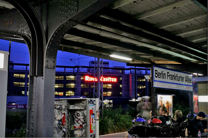 Das „Zentrum" des Rings liegt an der Frankfurter Allee. Was nach der Quadratur des Kreises klingt, hat mit einem Einkaufszentrum namens Ring-Center zu tun, das beidseitig der Station emporwächst und sie in den Schatten stellt. Hier fand in Nachwendezeiten das statt, was man architektonisch als „Würfel-Husten" umschreiben könnte. Doch an der großen Straße Richtung Frankfurt/Oder wurde bautechnisch auch schon in den Jahrzehnten zuvor eher geklotzt als gekleckert. Entstanden ist eine rote Meile ohne die sonst üblichen Damen des Gewerbes.