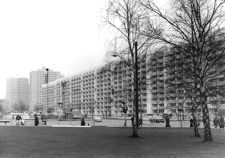Vorm westlichen Stationsausgang verläuft eine Gasse zwischen Bahnviadukt und der Steilwand des Konsumtempels; dicht gedrängt schieben sich die Passanten zur Allee. Deren Vorkriegsbebauung ist nur auf einem kurzen Straßenstück zu erahnen; die wenigen alten Häuser fallen neben den Retro-Plattenbauten mit ihren Erkern und Giebeln kaum auf. Zum Stadtzentrum hin verbreitert sich die Straßenschlucht nach einigen hundert Metern zum Prachtboulevard des Sozialismus, der ab dem Frankfurter Tor als Karl-Marx-Allee firmiert. Ursprünglich führte die Straße von den Außengrenzen der barocken Stadterweiterung Berlins zur weit entfernten „Colonie Friedrichsfelde". Die Verbindung diente den Preußen im 18. Jahrhundert als Heerstraße, bis die Russen sie 1945 auf ähnliche Weise nutzten. Hier lag einer der Angriffsschwerpunkte des sowjetischen Vormarsches auf die Schaltzentrale des Dritten Reiches. Um jeden Widerstand schon im Keim zu ersticken, zerschossen die Rotarmisten mit ihrer fahrbaren Artillerie Haus für Haus. Die Frankfurter Allee gehörte zu den am stärksten zerstörten Straßen der Hauptstadt.