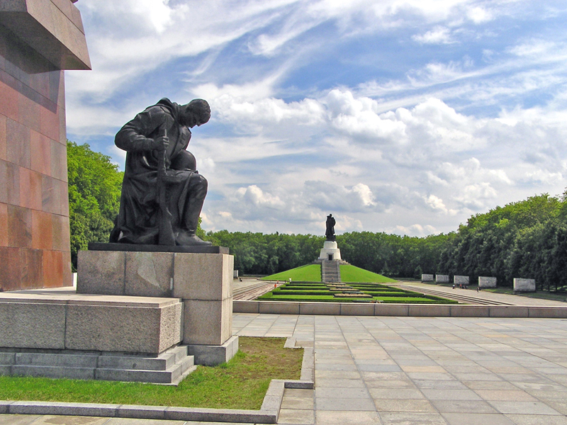 Verlässt man das Bahnhofsgebäude in Richtung Puschkinallee, erhebt sich an der Straße nach wenigen hundert Metern ein Triumphbogen aus grauem Granit – der Eingang zum sowjetischen Ehrenmal. Siebentausend im Kampf um Berlin gefallene Rotarmisten fanden in der eindrucksvoll mit Bronzestatuen und Marmorsarkophagen geschmückten Anlage ihre letzte Ruhe. Das Ehrenmal wurde am 8. Mai 1949 nur wenige Monate vor der DDR-Staatsgründung eingeweiht und dadurch später mit besonderer politischer Bedeutung aufgeladen.