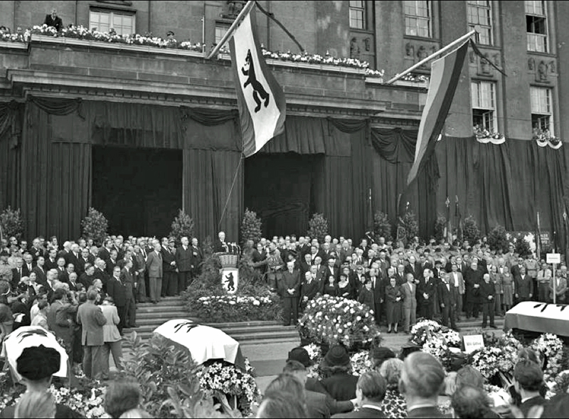 Gleich um die Ecke vom Funkhaus lag das politische Zentrum der Inselstadt, das Rathaus Schöneberg. Fast ein halbes Jahrhundert lang diente der Rathausplatz als Ort für Großkundgebungen, ob im Mai 1949 nach dem Ende der Blockade oder zum Gedenken an die Opfer des 17. Juni 1953, 1961 bei den wütenden Protesten gegen den Mauerbau genauso wie 1989 nach der Öffnung der Grenze. 1953 erwiesen Hunderttausende dem im Rathaus aufgebahrten Regierenden Bürgermeister Ernst Reuter dankbar die letzte Ehre, hatte er doch den zögerlichen Alliierten 1948 die rettende Luftbrücke abgezwungen: „Schaut auf diese Stadt und erkennt, daß ihr diese Stadt und dieses Volk nicht preisgeben dürft, nicht preisgeben könnt!" Den Erfolg der Politik Reuters konnten die auf dem Rathausplatz dicht gedrängten Westberliner 1963 bejubeln, als Kennedy ihnen zurief: „Ich bin ein Berliner!" Der RIAS übertrug live, freilich gingen nicht nur Sternstunden über den Äther. Als sich 1967 anläßlich des Schah-Besuchs neben winklustigen Senioren auch protestierende Studenten vor dem Rathaus sammelten, prügelten als Schah-Anhänger („Jubelperser") getarnte persische Geheimdienstler mit Totschlägern auf die Demonstranten ein, ohne dass die Polizei eingriff. Die Live-Berichte im RIAS heizten die Stimmung zusätzlich an, die Auseinandersetzungen zwischen Demonstranten und Polizei führten am Abend zum Tod Benno Ohnesorgs – ein Fanal für die 68er-Revolte.