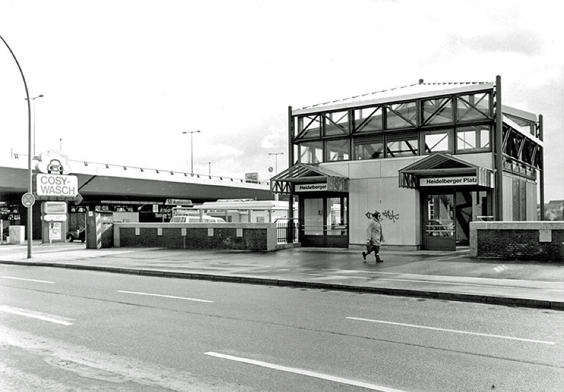 Der heutige Heidelberger Platz ist vor allem ein Verkehrsknotenpunkt im wahrsten Sinne des Wortes: vom Bahnsteig führen die Aufgänge hinauf zur breiten Mecklenburgischen Straße, die von der Stadtautobahn A100 überbrückt wird; unterirdisch kreuzt die U-Bahnlinie 3. In Richtung Autobahn befindet sich das alte Empfangsgebäude von 1892, das mittlerweile den Dancefloor einer Diskothek beherbergt. Auf der gegenüberliegenden Seite der Straße glänzt das Leuchtschild einer Autowaschanlage, die beliebter Treffpunkt für Mitfahrgelegenheiten nach Heidelberg und ganz Deutschland ist. Durch das Zusammentreffen vieler öffentlicher Verkehrsmittel an der Auffahrt zur A 100 eröffnen sich hier beste Abreisemöglichkeiten aus Berlin. Der unmittelbar darunter liegende U-Bahnhof von 1913 nimmt als neoromanischer Prachtbau erkennbar Bezug auf den deutschen Sehnsuchtsort. Eine Reihe monumentaler Rundsäulen aus Granit trägt das doppelte Kreuzgratgewölbe, an den Bahnsteig-Enden befinden sich mosaikgeschmückte Vorhallen, und auch die Großaufnahmen des heutigen Heidelbergs vermitteln das Klischee von „Good Old Germany“. Zwar lagern hier unten keine Eichenholzfässer, trotzdem könnte die Atmosphäre Passanten in badische Weinseligkeit verfallen lassen.