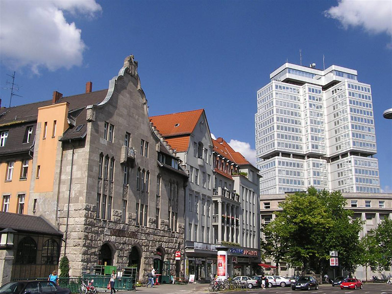 Im Hintergrund glänzt das mit Aluminium bekleidete, 1977 fertig gestellte 23-geschossige Hochhaus der „Deutschen Rentenversicherung Bund“. Die Abteilung 80 ist hier bezeichnender Weise zuständig für alles, was mit Rehabilitation zu tun hat. Die deutsche Altersversicherung geht immerhin auf die Bismarcksche Sozialgesetzgebung zurück und wurde bereits 1891 eingeführt. Dabei liegt eine gewisse Kontinuität in der Bedeutung des bürgerlich-konservativen Wilmersdorfs als Verwaltungsstandort, weitere Behördenbauten, unter anderem aus nationalsozialistischer Zeit, befinden sich am östlich gelegenen monumentalen Fehrbelliner Platz.