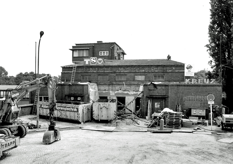 Zwar kann man die helle Bahnsteighalle über eine Treppe am nördlichen Ende verlassen, doch eingeschnürt von Gleisen und Stadtautobahn scheint das Umfeld eine sinnvolle Bewegung per Pedes kaum zuzulassen. An Stelle des Empfangsgebäudes gähnt heute die asphaltierte Leere eines Parkplatzes; da der Bahnhof auf Sumpfland gebaut worden war, gerieten die Anlagen mit den Jahren aus dem Lot und konnten trotz erheblicher Anstrengungen nicht gerettet werden – Anfang der 1990er Jahre erfolgte der Abriss. Von der legendären „Avus“-Rennstrecke, die mit ihrer berüchtigten Nordkurve nahe am Bahnhof vorbei führte, zeugen noch Spuren inmitten des Autobahndreieckes; hier wartet eine verlassene Zuschauertribüne seit Jahren vergebens auf Publikum, und der alte Zielrichterturm dient heute als Motel. Nahebei befindet sich Berlins größtes „Wellnessbordell“, das voll auf den motorisierten Individualverkehr setzt. In unmittelbarer Nachbarschaft, eingezwängt zwischen ausrangierten Gleisschleifen, trotzen die farbenfroh bepflanzten Parzellen der Kleingärtner der Aufenthaltsfeindlichkeit des Ortes.