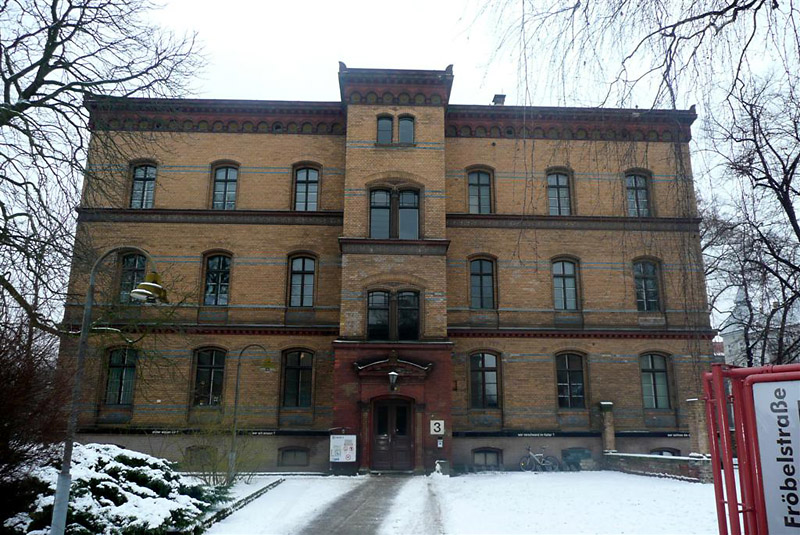 Gleich neben diesem Ort künstlicher Höhenflüge tun sich Abgründe deutscher Geschichte auf: „wer verschwand im Keller? ... wer hörte nachts die Schreie? ... wohin traf der erste Schlag?" – diese und weitere Fragen reihen sich auf einer schwarzen Leiste, die rund um das Eckgebäude an der Fröbelstraße verläuft. Das Kunstwerk „fragen" von Karla Sachse erinnert seit 2005 an die Verbrechen, die hier begangen wurden. Ursprünglich gehörte der Bau zum „Hospital und Siechenhaus", einer Musteranlage der städtischen Gesundheitsversorgung. Im Keller richtete der stalinistische Geheimdienst NKWD im Mai 1945 ein Gefängnis ein, in dem wirkliche und angebliche Gegner der sowjetischen Besatzungsordnung verhört und gefoltert wurden. Dazu gehörten ehemalige Nazis wie auch Demokraten, bekennende Christen, sogar Kommunisten und vollkommen Unbeteiligte. Von diesem Keller aus begann für die meisten von ihnen eine Reise ohne Wiederkehr durch das Lagersystem der Sowjetischen Besatzungszone. Später nutzte die Stasi das Gelände für ihre Berlin-Observation.
