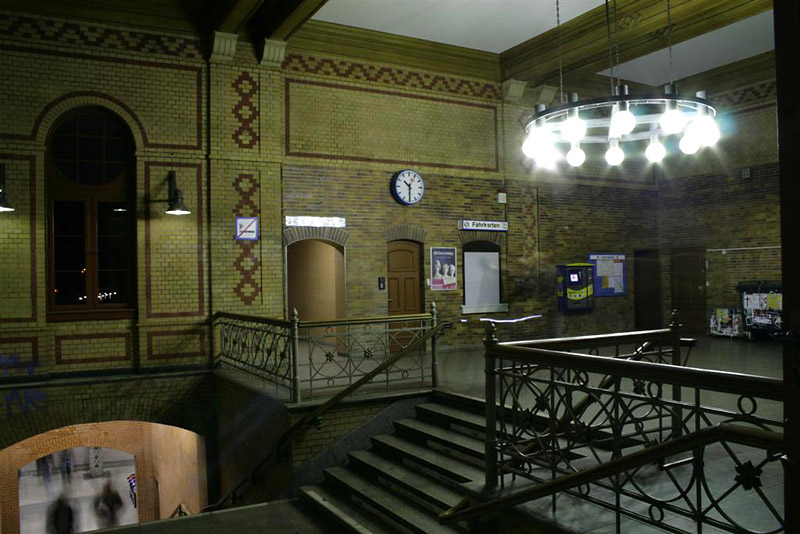 Gleich einem Schlösschen thront das neoromanische Empfangsgebäude über der tiefen Gleisschlucht an der Prenzlauer Allee. Ein langer Treppenaufgang führt vom Bahnsteig hinauf in die mit Klinker-Ornamenten geschmückte Halle. Hoch oben schwebt ein mächtiger Hängeleuchter und wirft sanftes Licht auf die darunter durcheilenden Passanten. Selten findet sich ein so gut erhaltenes Bauwerk aus vergangener Ringbahnzeit – 1892 wurde die Station eingeweiht, aber vom Augenschein her könnte es auch gestern gewesen sein.