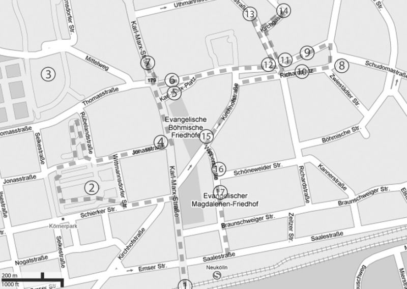 Zurück auf der Karl-Marx-Straße ist der aus dem 18. Jahrhundert stammende Friedhof auf der anderen Straßenseite, der Böhmische Gottesacker [5], der sichtbarste Hinweis auf die Ursprünge des Viertels als Heimstatt der böhmischen Glaubensflüchtlinge. Geradezu auf der linken Seite der Karl-Marx-Straße öffnet sich der Karl-Marx-Platz, wo die berühmte Blutwurstmanufaktur [6] seit 1902 bestes Fleisch und traditionelle handgemachte Wurstspezialitäten offeriert. Ein paar Schritte weiter oben an der Karl Marx-Straße gibt es mit dem Künstlerhof Rue Bunte [7] eine malerische Oase im Hinterhof zu entdecken, die mit Ateliers, Open-Air-Theater, Workshops, Musikproberaum und Aufnahmestudio von Künstlern unterschiedlichster Genres bespielt wird.
