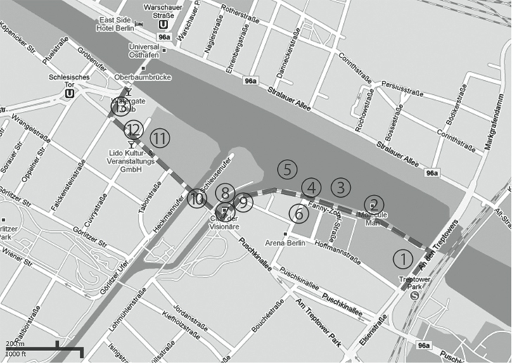 Nördlich der Ringbahnstation drängen sich drei Hochhäuser zu einem winzigen Downtown zusammen; die steilen Glasbeton-Nadeln markieren die Grenze zwischen der steinernen Stadt und dem Landschaftspark. Im Schatten der Treptowers [1] führt der Weg über eine mehrspurige Straße an die Spreepromenade. Über schlanke Büroriegel hinweg schweift der Blick zum Molecule Man [2] und einem halbversunkenen Schiff [3]. Die ersten Bauten des umstrittenen Stadtentwicklungsprojekts „Mediaspree" – ein Zankapfel, der das ganze Ufer bis ins Stadtzentrum entlang rollt – kommen in Sicht. Ein alter Salondampfer erwartet den Besucher flussabwärts. Es war ein mühsamer Weg vom Stettiner Haff bis nach Berlin, auch wenn das heutige Restaurantschiff Hoppetosse [4] nicht ganz wie bei Fitzcarraldo transportiert werden musste – anstatt eines Berges bildeten niedrige Brücken das Hindernis. So wurde das oberste Deck abgeschweißt, fuhr auf einem Schubkahn dem Mutterschiff hinterher und gelangte am Treptower Kai wieder an seinen angestammten Platz. Bei einem Kaffee oder Pils lässt sich das Treiben am Badeschiff [5] und auf der zwiebelbetürmten Oberbaumbrücke bewundern. Am Wochenende lädt der Hallentrödelmarkt Treptow [6] in einem alten Busdepot zum Stöbern ein. Über das Gelände der Arena-Hallen geht der Spaziergang weiter bis zum Landwehrkanal, an dessen Böschung eine Treppe hinab führt zum Club der Visionäre [7]. Hier erholen sich die Creatures of the Night auf schwimmenden Pontons – eine Großstadtidylle zu weichen elektronischen Klängen. Am gegenüberliegenden Ufer, der Zugang erfolgt über die kleine Oberfreiarchenbrücke, liegt das etwas gesetztere Caférestaurant Freischwimmer [8] für Kaffee mit Kuchen und gehobene Küche. Am Wachturm [9] geht es nach einem kurzen Abstecher zu einem der schönsten Biergärten Berlins, in dessen Haupthaus sich eine gepflegte Cocktailbar befindet, das Heinz Minki [10], die Schlesische Straße weiter entlang bis zur Café-Bar Cake [11]. Im Stil der 60er Jahre eingerichtet, wartet sie mit einer echten Jukebox auf. Ein paar Meter weiter lädt zur richtigen Uhrzeit das Myslivska [12] ein – diese Bar ist kein Ort, sondern ein Zustand. An der Kreuzung Falckensteinstraße um die Ecke in Richtung Oberbaumbrücke: im reizenden Café San Remo Upflamör [13] mit seinem 50er-Jahre-Charme fällt der Blick auf die nahe Hochtrasse mit der vorbeiratternden U-Bahn. Von der Oberbaumbrücke belohnt ein fantastischer Blick in Richtung Treptower Park für den weiten Weg und die müden Füße. Zurück geht es zum Schlesischen Tor, einem einzigen Rastplatz für hungrige Nachtgestalten, dann weiter die Falckensteinstraße entlang bis zum Görlitzer Park. In dieser reizvollen Grünanlage ist die Ruhe der Natur vor lauter Grillfanatikern und Feierwütigen gerade am Wochenende schwer zu finden. Die Görlitzer Straße führt an ruhigen Altbauten vorbei zum Heckmannufer und zurück zur Schlesischen Straße. Vorbei am einem der letzten erhaltenen Wachtürme der Berliner Mauer geht es über die Puschkinallee wieder zum Ringbahnhof Treptower Park, wo mit dem nächsten Zug die Reise durch Berlin fortgesetzt werden kann.