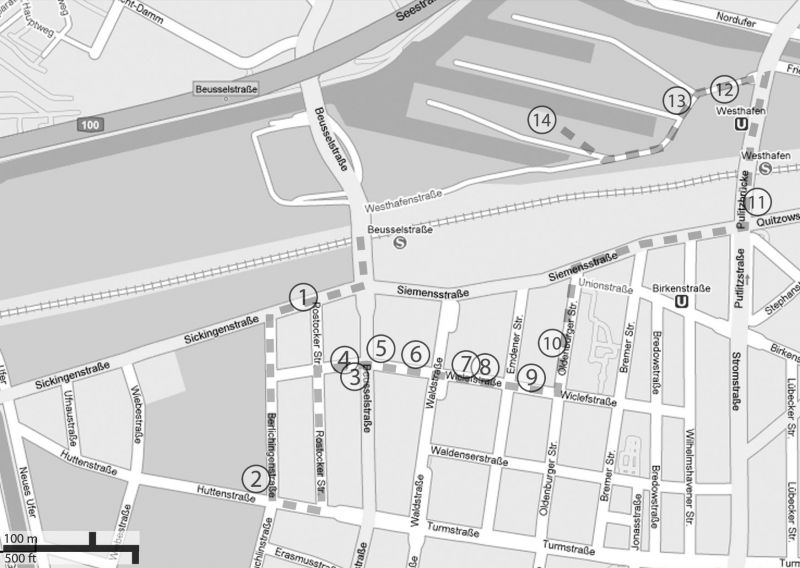 Folgt man dann der Oldenburger Straße nach rechts, begegnet einem am Unionplatz eines der wenigen noch existierenden historischen „Café Achteck“-Pissoirs. Der Besuch sei nur Herren empfohlen. Bevor der Spaziergang zum Westhafen weiterführt, lohnt sich ein Blick rückwärts in die Siemensstraße auf eine lange Reihe wunderschöner Pappeln. Die alten Bäume sollen für den Bau eines Gastronomiegroßmarktes auf dem Gelände des ehemaligen Güterbahnhofs Moabit beseitigt werden. Ihr Schicksal ist noch nicht abschließend geklärt; viele Einwohner kämpfen darum, das prägnante Bild ihrer Straße zu retten. Der Weg zum Westhafen führt weiter die Quitzowstraße entlang, wo KFZ-Werkstätten, Glasereien und Umzugsfirmen aufeinander folgen und eine Kulisse für den rasenden mehrspurigen Verkehr abgeben. Weiter über Serpentinentreppen gelangt man auf die Putlitzbrücke. Der Eindruck, dass in diesem Teil Berlins das Versorgungs- und Großhandelszentrum steht, bestätigt auch die benachbarte große Markthalle für asiatische Lebensmittel [11].