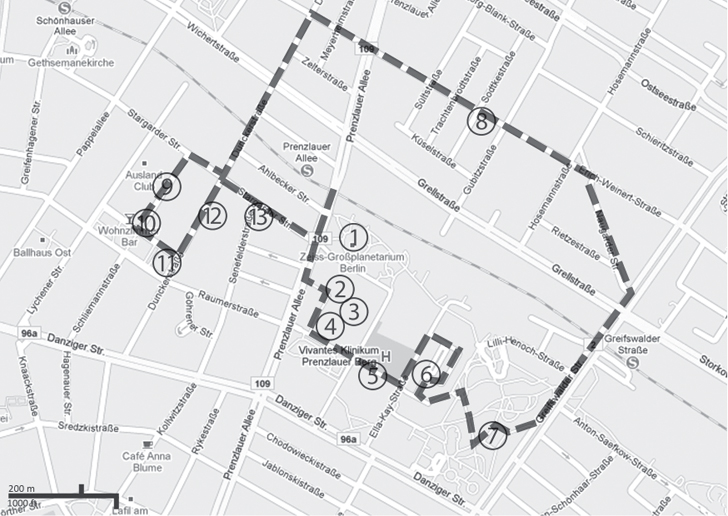 Die Dunckerstraße und die Stargarder Straße erlauben einen kleinen Abstecher in die Wohnwelt der Gründerzeit und den Anfang des Gentrifizierungsbereichs von Prenzlauer Berg. Nach ein paar Schritten in die Seitenstraße sind die Häuser komplett saniert, erscheinen Bioläden und Büros der „Was mit Medien"-Fraktion und schlürfen schick gekleidete Menschen ihre Suppe [9] oder ihren Bica in Cafés mit Omasofas wie der Wohnzimmerbar [10]. Auf dem Weg zurück zur Prenzlauer Allee warten weitere Entdeckungen: das eka [11] versammelt Künstler, Kreative und die Anderen. Wer mag, dem sei ein kleiner Abstecher in die von Heimsenioren gestaltete Ausstellung „Zimmermeister Bruntzel baut ein Mietshaus" [12] in der Dunckerstraße empfohlen. Für eine Stärkung bietet das Alois S. [13], ein legeres Kiezrestaurant mit praktischer Anbindung an einen Spielplatz, den richtigen Ort. Schließlich geht es rechter Hand zurück zur Prenzlauer Allee, von wo die Ringbahnreise nun fortgesetzt werden kann.