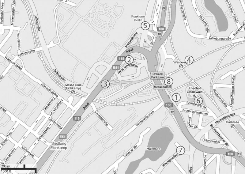 3. AVUS (Automobil-Verkehrs- und Übungs-Straße) | Next to the round tower are the bleachers as well as the north curve of the first landmark-protected motorway in Europe; all looking run-down | Nordschleife | www.kunstraum-avus.de